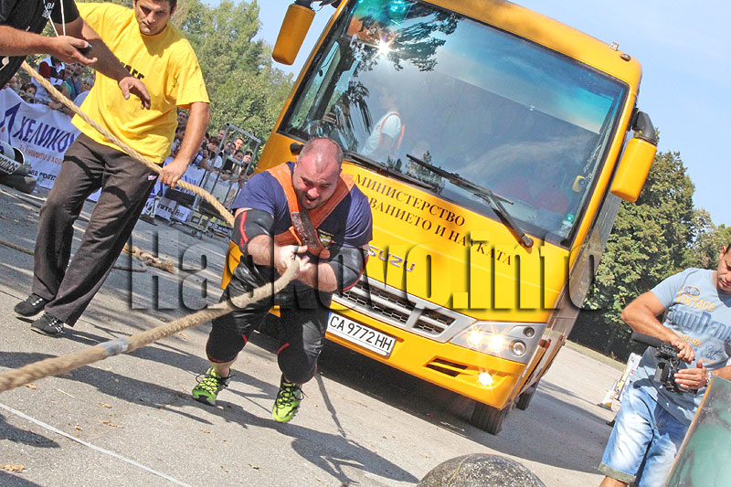 Осем здравеняци започнаха състезанието си в общо 6 дисциплини с теглене на 6-тонен ученически автобус на разстояние от 20 метра за време. За да им е малко по-трудно автобусът бе напълнен с деца, с което теглото му се увеличи с около 1.5 тона.