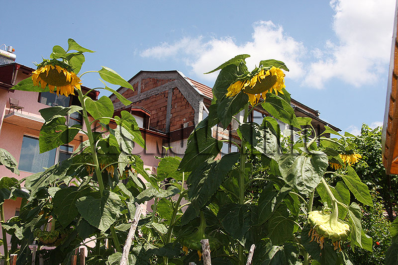 Слънчогледите растат до лехите с доматите и се извисяват над човешки бой. В махалата дори се обзалагат, че растенията ще надхвърлят 3.20 метра.