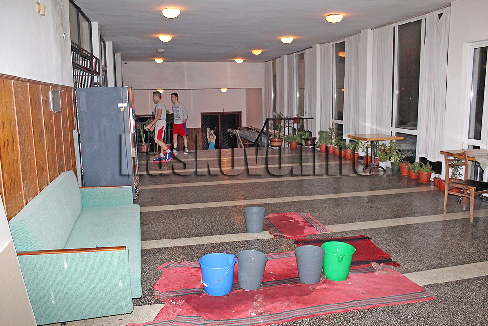 В коридора на зала „Дружба“ са поставени 5 кофи и черги, които да събират водата от протеклия таван.