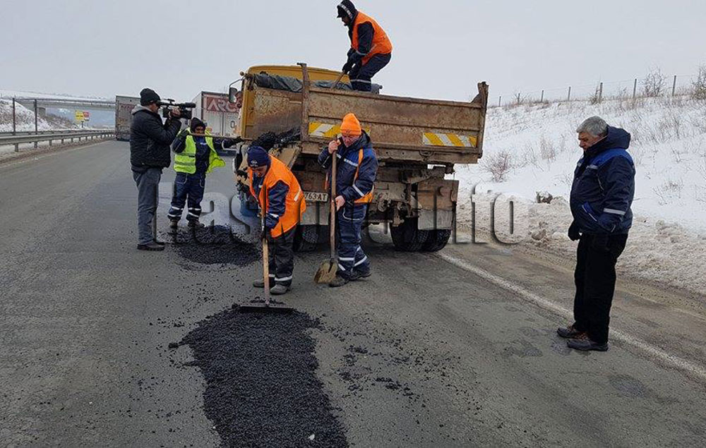 Изкърпването на автомагистрала „Марица“ в района на Свиленград продължава. Работници запълват със студена асфалтова смес дупките.