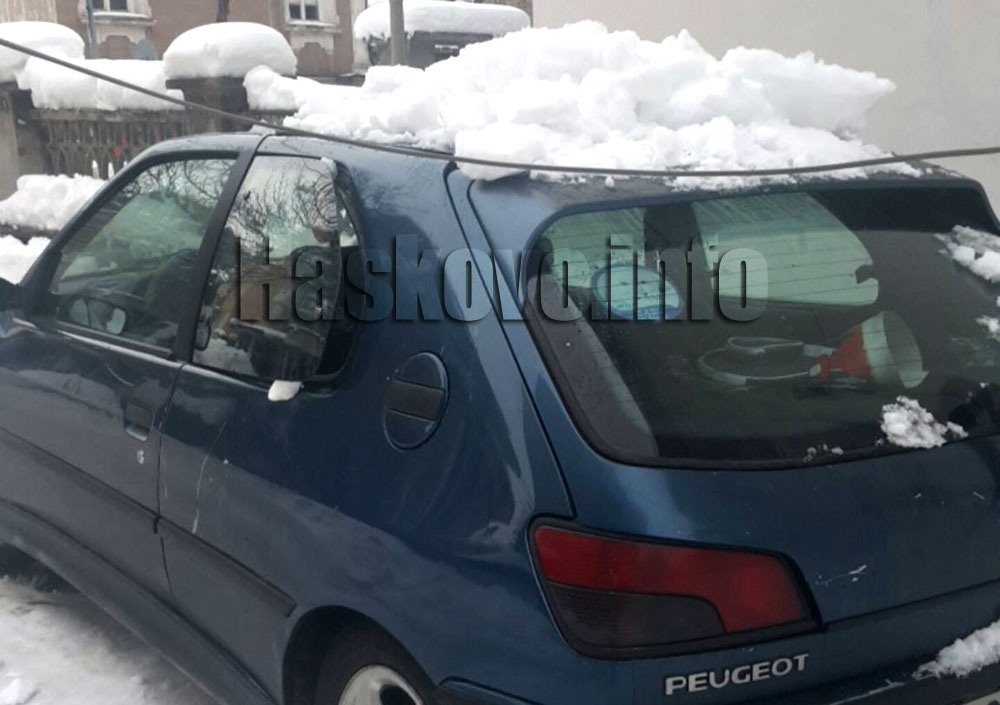 Огромна лавина от сняг се откъсна от покрива на къща на хасковската улица „Алеко Константинов“ и се стовари върху „Пежо“, сигнализираха читатели на Haskovo.info, които изпратиха и снимки.