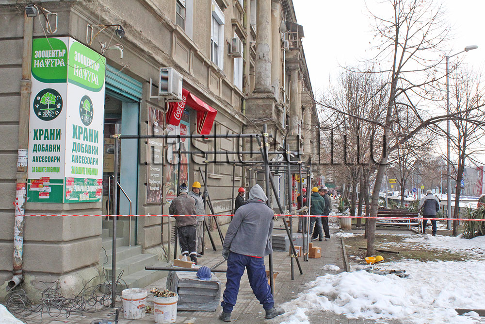 Тази сутрин работници започнаха да вдигат скелето върху което ще бъде поставен и ламариненият покрив. Целта е минувачите да се защитят от падащите парчета от фасадата.