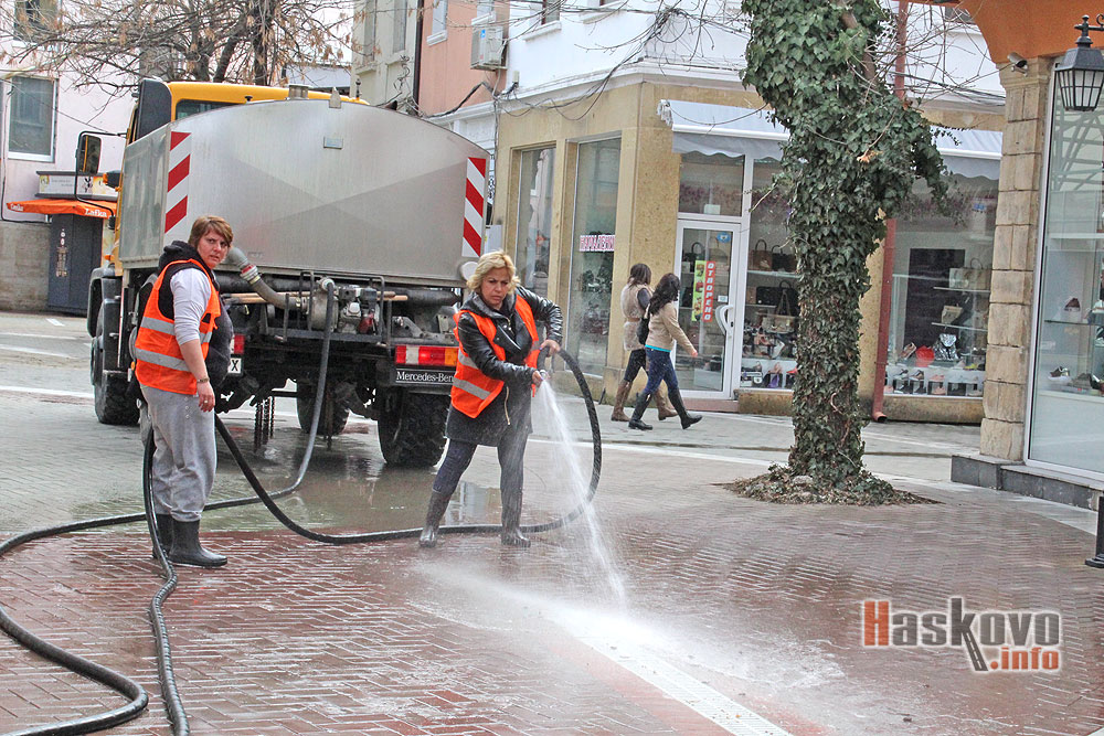 От хасковската фирма по чистотата миха с вода пешеходната зона на областния град за националния празник Трети март.