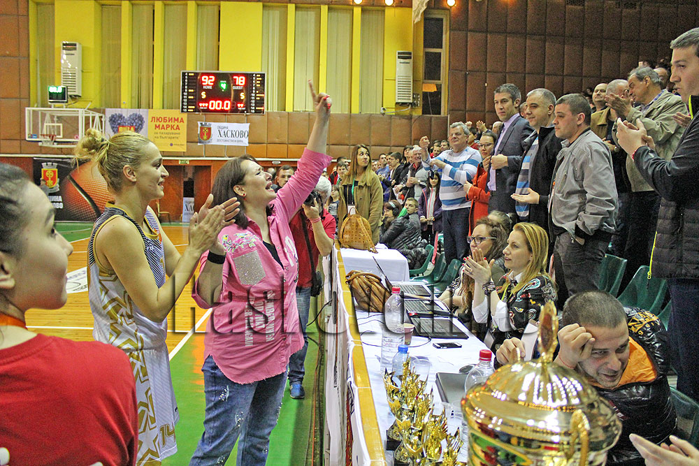 – Да така е. При нас не става въпрос за оцеляване месец за месец. Ние се борим всяка секунда за оцеляването на отбора. И няма да разкрия някаква тайна, ако кажа, че съществуването на един професионален отбор изисква много средства. Аз съм изключително благодарна на Делян Добрев. И тук не политизирам и не агитирам. Този човек беше първият, който повярва в нашия отбор. Още докато беше министър Делян Добрев осигури спонсорство на клуба. После, когато този ангажимент на спонсора приключи, продължи да ни подпомага лично. И го прави и до днес. Това са фактите. Спортът е кауза, а не политика. Вие видяхте снощи в залата имаше представители и на други политически сили. И това е нормално. Спортът е обединител. Това е нашата мисия. Освен това съм изключително благодарна и на кмета на Хасково Добри Беливанов. Това е един невероятен човек, много добре настроен към спорта. Той разбира от какво имаме нужда и винаги е готов да ни помогне. Аз не искам да изпадам сега в подробности от кухнята на отбора, но трябва да ви призная, че без подкрепата на общината и на Добри Беливанов, снощният празник на победата нямаше да го има.