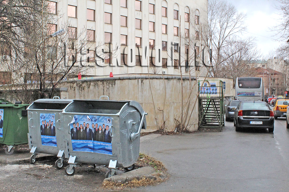 Има плакати върху спирки на градския транспорт, контейнери за смет огради и други непозволени за разлепване на агитационни материали места.