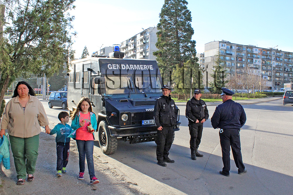 Жандармерия и полицаи има още на бул. „Васил Левски“ до бензиностанцията преди кръстовището за АГО. Жандармеристи в патрулка са пред банята, а друг екип е с полицейски джип до пазара в махалата.
