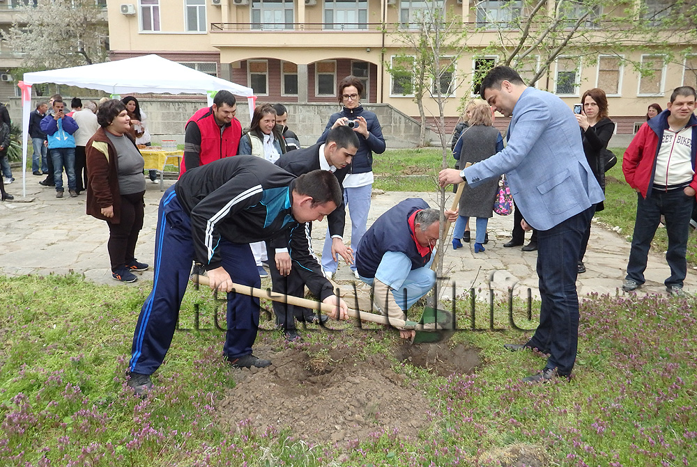 Двамата засадиха дръвчета в двора на дневните центрове за деца и възрастни с увреждания в града.