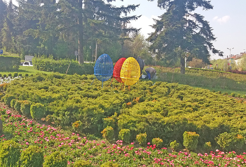 Великденска украса от три стилни яйца в жълто, синьо и червено бяха поставени на единия от входовете на града, с най-интензивен трафик.