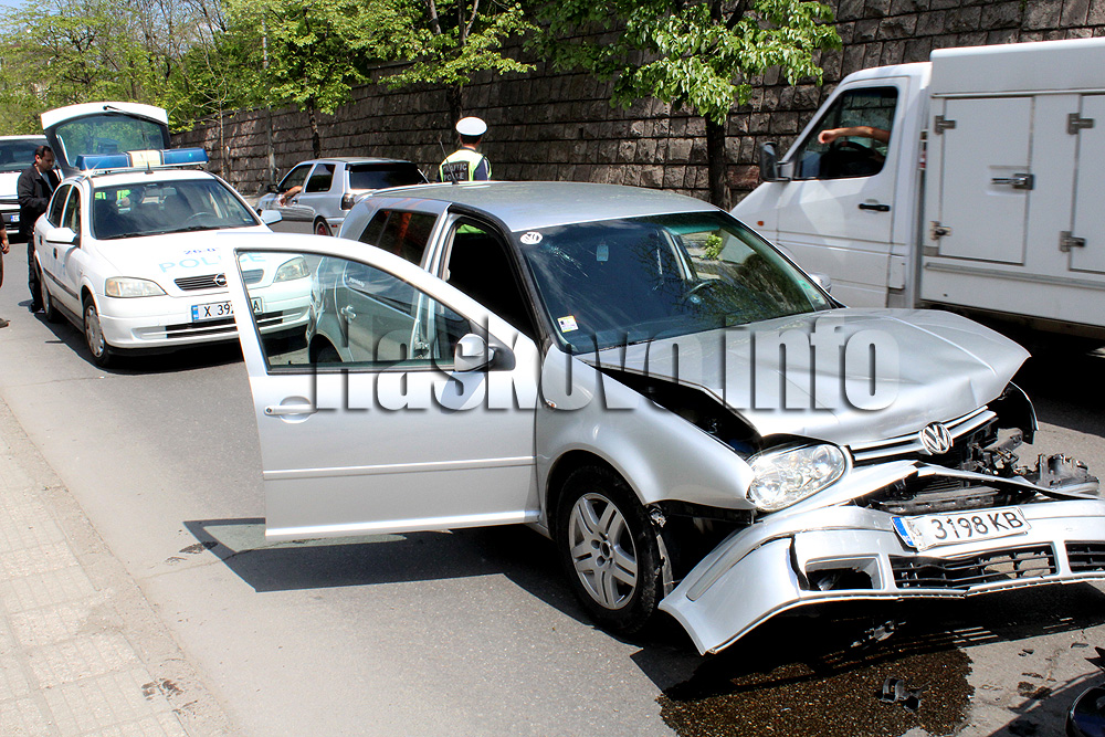 Бургаската кола намалила в трафика, когато в нея се забил хасковският Фолксваген. Жена, която се е возила в последния се е ударила в главата и е откарана в болницата. Според нейните близки тя не е сериозно пострадала.