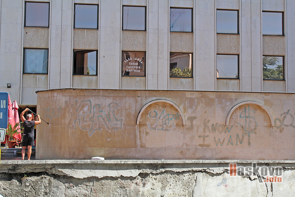 Почистване на графитите и надписите от южната страна на Бизнес центъра в Хасково започна тази сутрин.