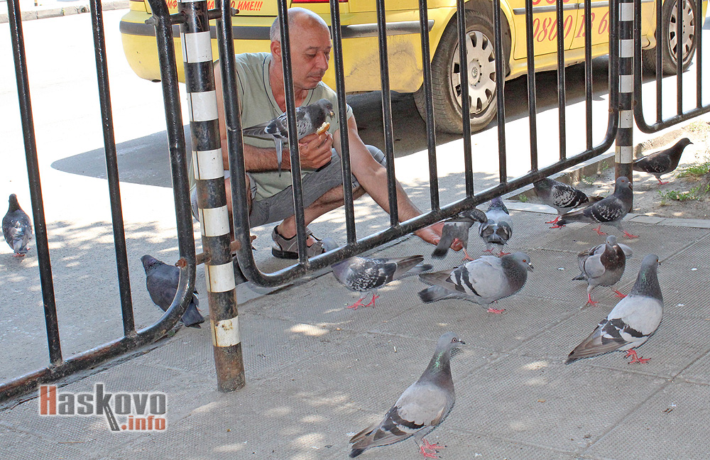 Хасковлия храни от ръката си гълъбите на таксиметровата пиаца до автогарата в Хасково.