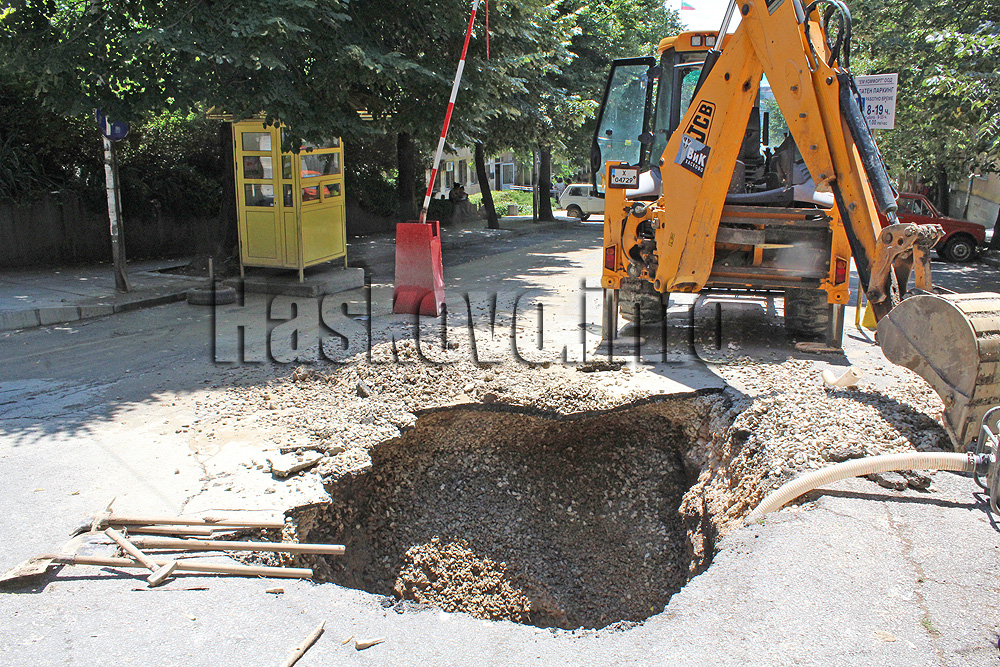 Проблемното място е точно на бариерата, където багер е изкопал дълбока дупка, за да се стигне до спуканата тръба. От водното дружество обясниха, че аварията е успешно отстранена, но към 13 часа все още се чакаше камион с чакъл за да се запълни дупката.