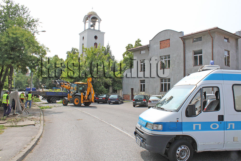 Разчистване на изсечени клони от дърветата около паметника-морена до църквата „Света Богородица“ затвори булевард „България“ от моста в посока Градската градина в Хасково.