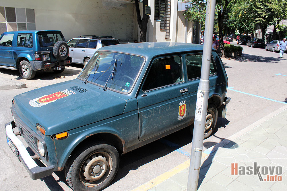 „Лада Нива“ с герба на община Хасково и пропуск на стъклото е със залепен стикер за глоба в синята зона зад кметството.