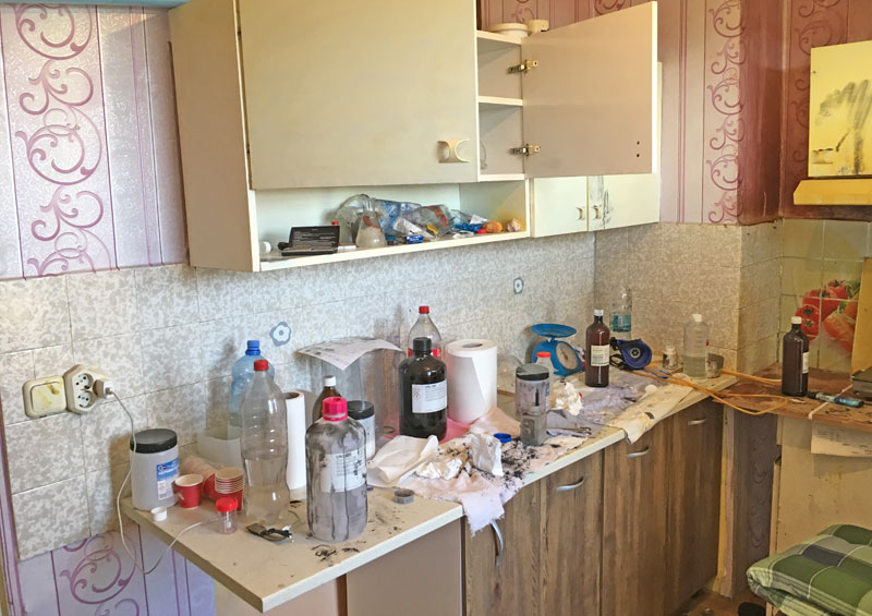 Както Haskovo.info писа, вчера в квартирата на руснака на улица „Оборище“ в Хасково бяха открити и иззети различни вещества, използвани за производство на наркотици – дестилирана вода, противогази, натриева основа, везни, котлони, фосфор, 36 литра друг разтвор, стъклена купа с остатъчно вещество, реагиращо на метамфетамин, и 20 броя стъклени епруветки с различна вместимост. Установено е, че жилището било оборудвано като лаборатория за производство за синтетични наркотични вещества.