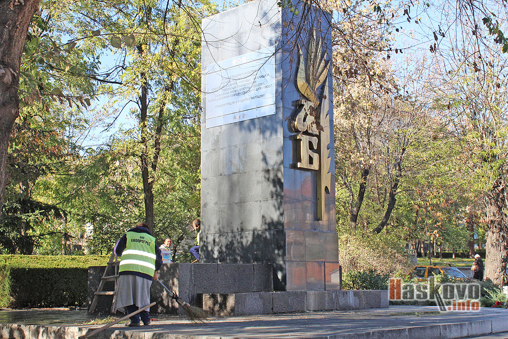 От "Екопрогрес" чистят паметника на будителите в Хасково за утрешния 1 ноември.