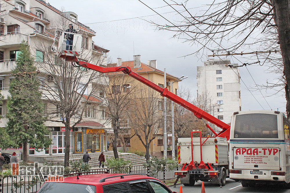 Въпреки силния вятър, работници с вишка поставят Коледно-новогодишна украса по хасковския булевард „Раковски“.