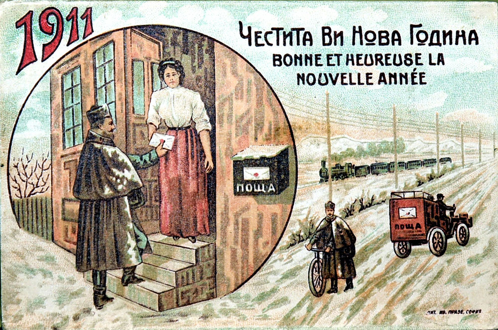 Съгласно тогавашната мода, собствени картички разпространявали и самите раздавачи. На лицевата страна пощальонът е нарисуван в задължителната униформа, а на гърба е поместено римувано обръщение. Ето какво пише някогашният пощенски телеграмен раздавач Никола Стоянов в навечерието на 1907-ма: „Да сте весели, засмени, да сте румени, червени, да живейте дълги дни, да дочакате добрини. Това аз ви пожелавам, и картичка ви подавам“.