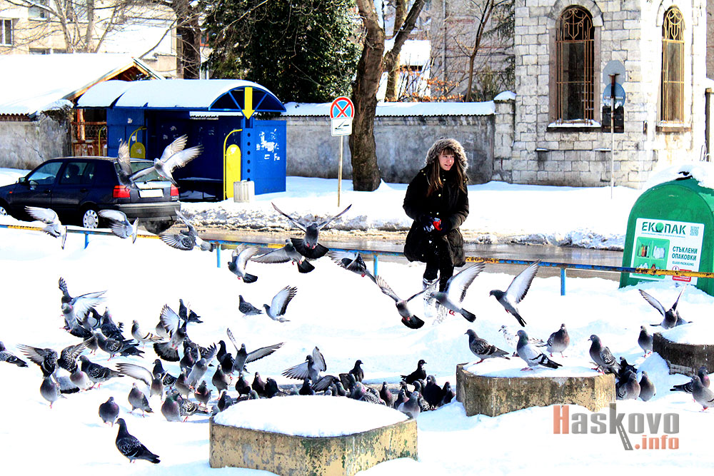 Момиче храни гълъбите в снега до църквата "Архангел Михаил" в Хасково.