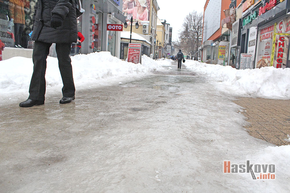 Читатели на Haskovo.info сигнализираха, че с дъжда пешеходната зона на Хасково е опасна заради непочистения лед.