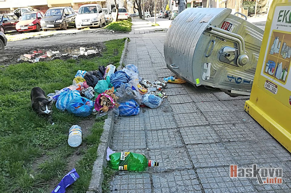 Обърнат контейнер е затапил с боклуци тротоара по улица „Георги Кирков“ в Хасково.