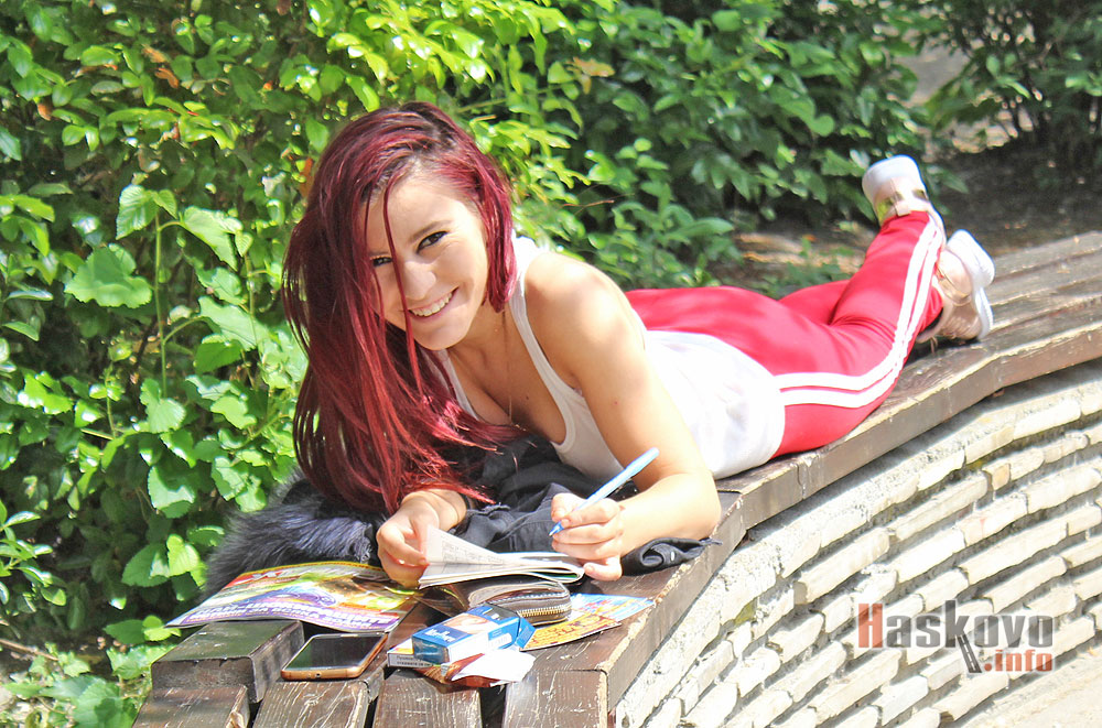 Момиче решава кръстословица на пейка в центъра на Хасково.
