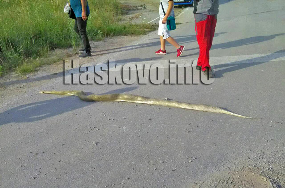 Гигантска змия изпълзя на пътя край хасковското село Клокотница, сигнализираха читатели на Haskovo.info, които изпратиха и снимки.