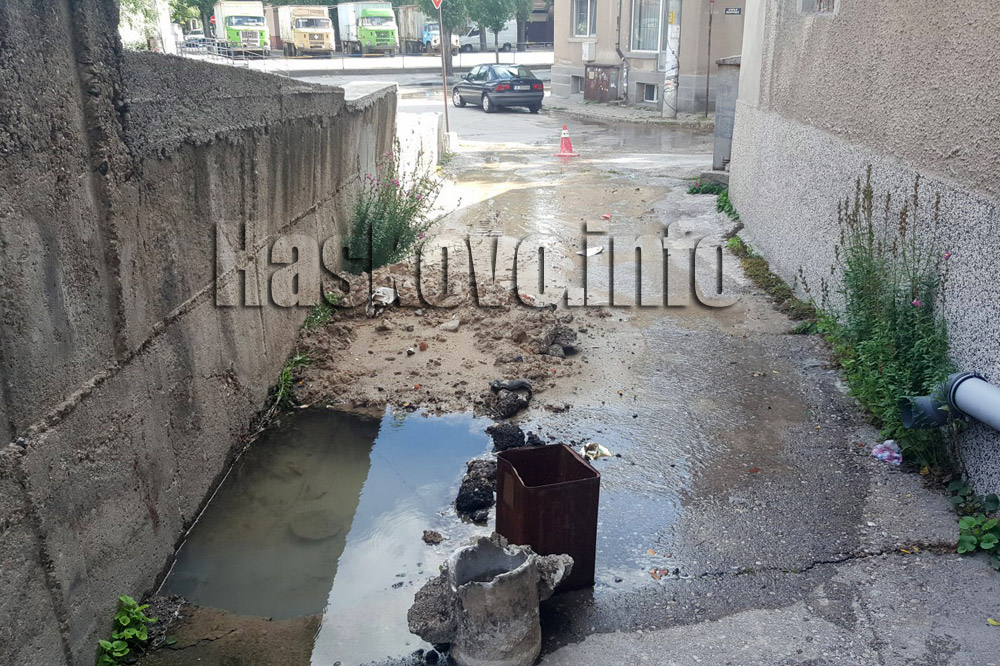 „След тридневни обаждания на ВиК – Хасково, на четвъртия ден от аварията най-сетне дойде екип. След като техниците на фирмата пристигнаха на място решиха да копаят в подстъпа към входа на кооперацията. Разбиха асфалтовата настилка и стигнаха до констатацията, че аварията не е там и ще трябва да копаят другаде. Поставиха един разбит конус, обещаха да поправят