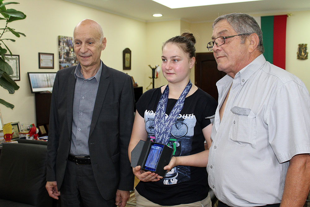 Щангистката заедно с треньора си Живко Архондев показаха на кмета трите сребърни медала от Европейското първенство за кадети и кадетки в Милано, Италия. Хасковската състезателка е втора в категория до 69 кг. при кадетките до 17 години с двубой от 186 кг.
