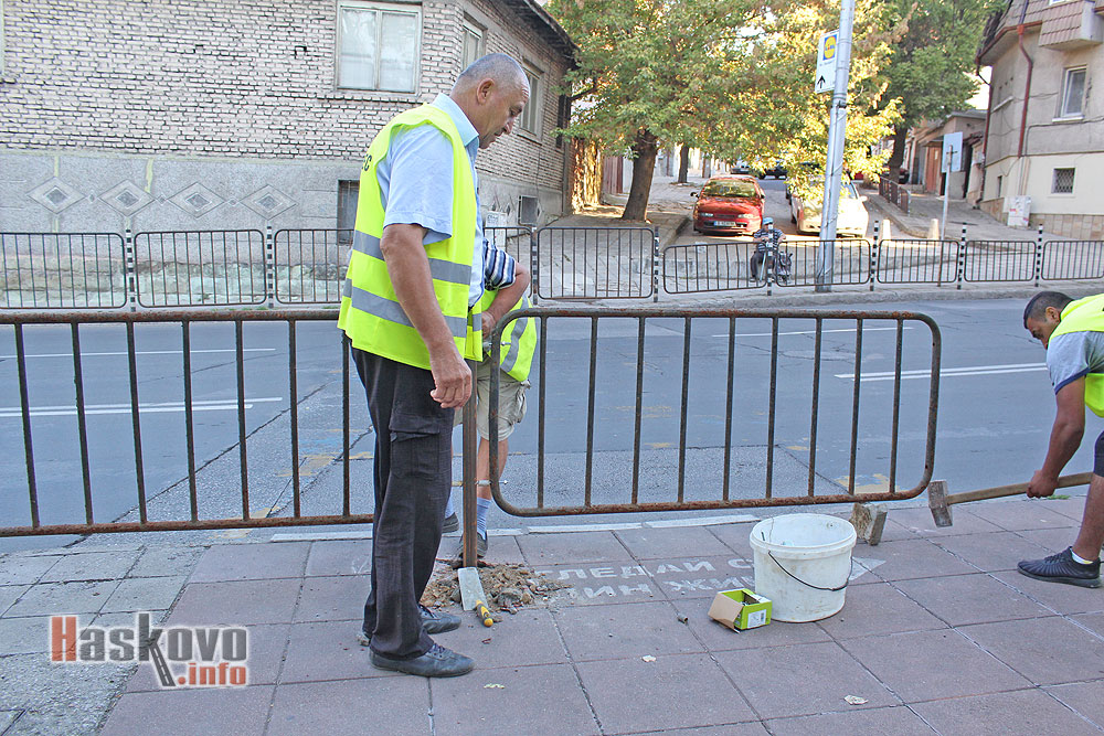 Работници от общинското предприятие „Екопрогрес“ заградиха тази сутрин и от другия край премахнатата пешеходна пътека на хасковския булевард „Съединение“ до кръстовището при зеленчуковия пазар.
