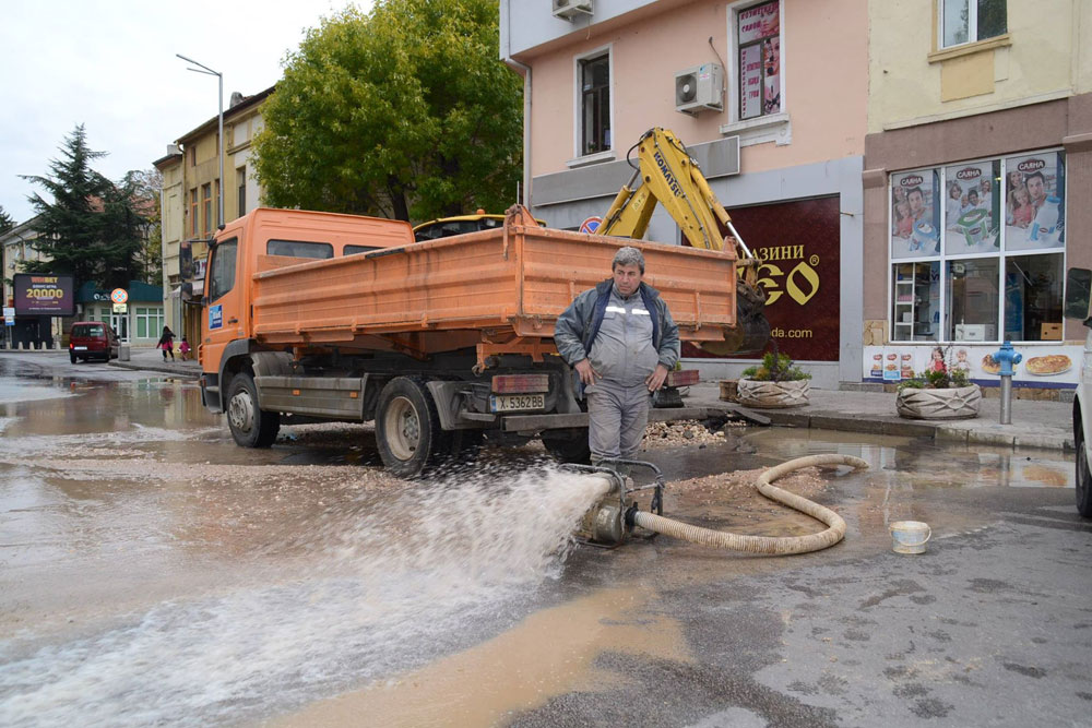 Аварийният екип на ВиК разкопа асфалта пред бариерата на общината. Заради изпомпването на водата беше наводнено булевардното платно.