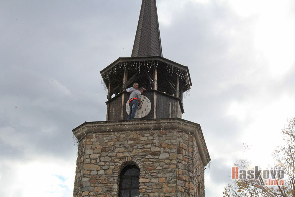 Майстори монтират обратно свалените за ремонт часовници на кулата в центъра на Хасково.