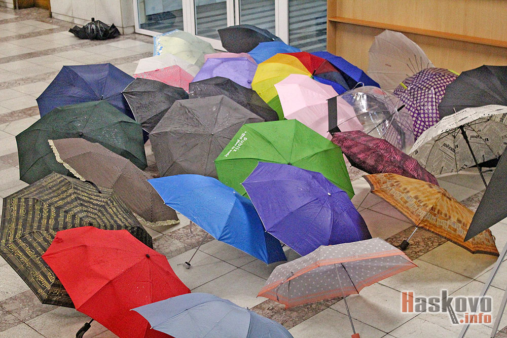 Много чадъри съхнат във фоайето на областна администрация в дъждовно Хасково.