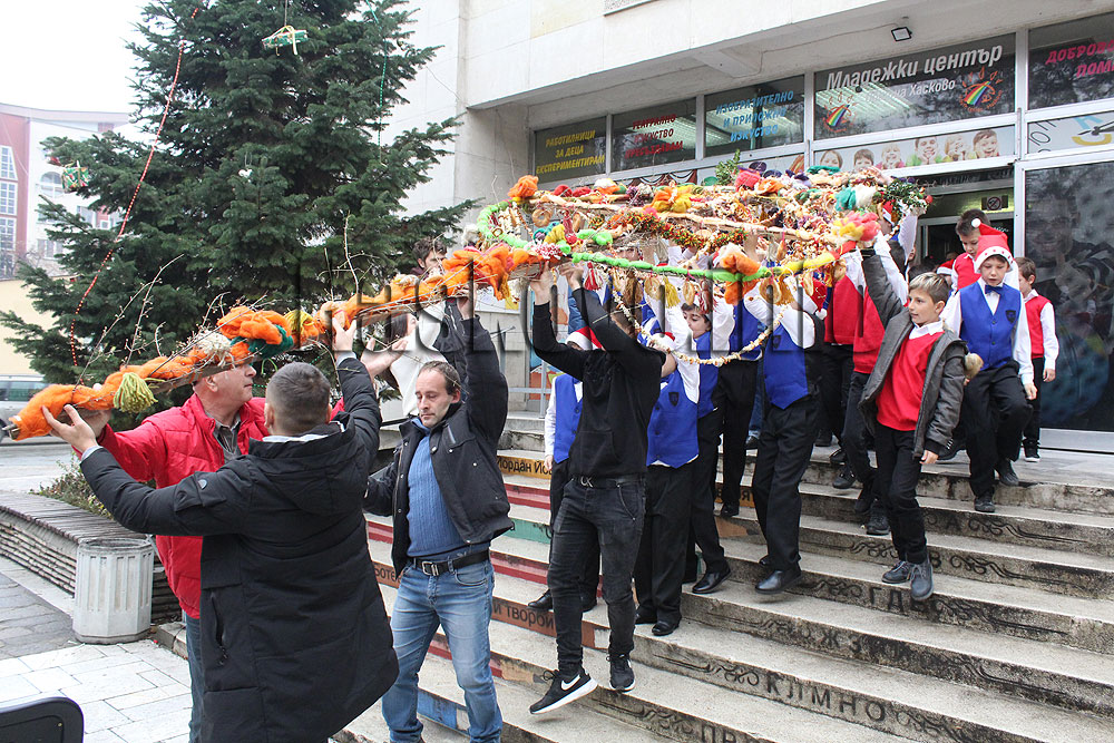 Десетки деца издигнаха гигантската сурвачка пред Младежкия център в Хасково