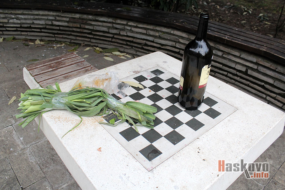 Остатъци от Коледна трапеза не са почистени от маса за шах пред малкия бизнесцентър в Хасково.