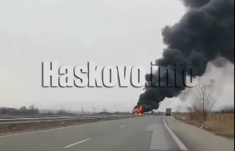 Турски товарен автомобил е избухнал в пламъци в платното от Харманли към Свиленград. Извил се е гъст дим.