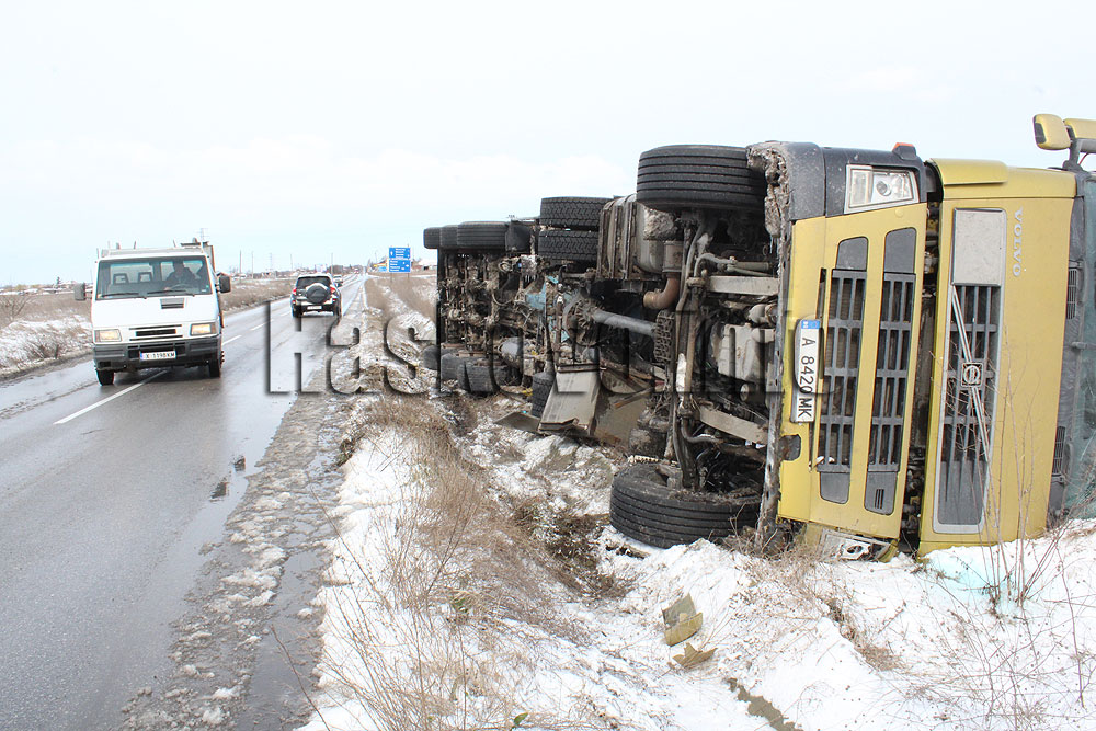 Камион се преобърна в канавката край Манастир, до 10 сантиметра сняг в Хасковско