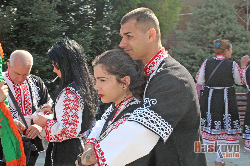 Танцьор е прегърнал любимата си пред зала „Дружба“ в Хасково, където се провежда националният фестивал „Хайдушка софра“.