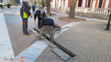 Работници на „Екопрогрес“ почистват шахтите по пешеходната зона на Хасково преди следващите валежи.